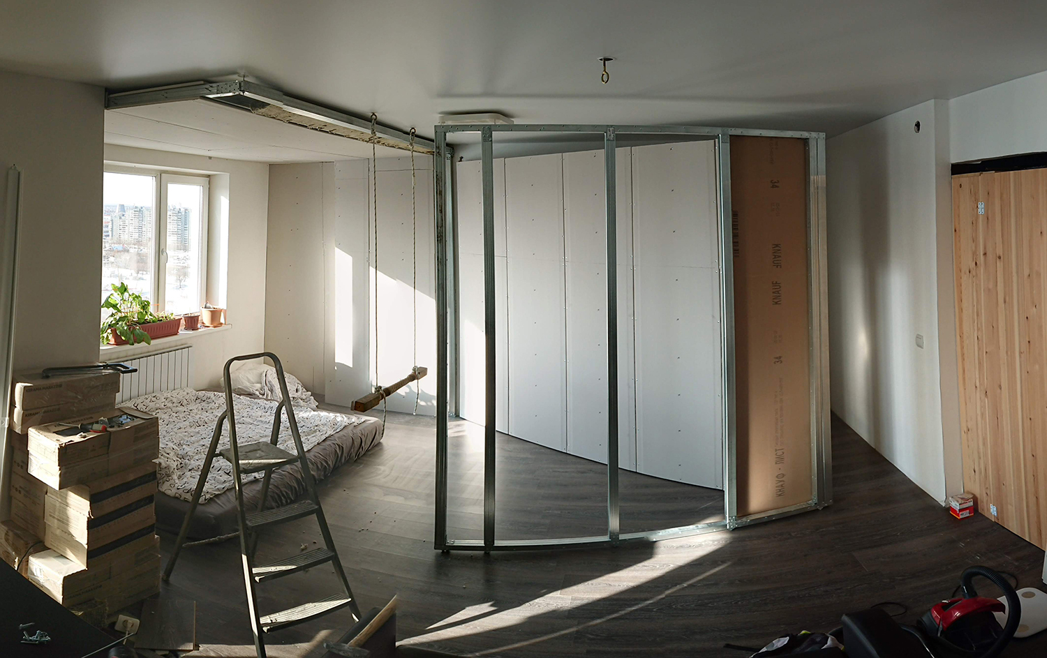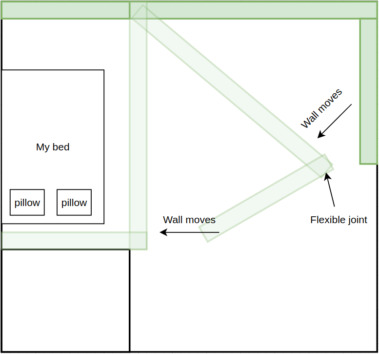 A bit hard to visualize, but this is a moving wall I made! It let me to transform the whole room (I live in a studio) when I want to. This wall moves an a very strong wells and cover my sleeping area from the rest of the room. Here is a better visualization: